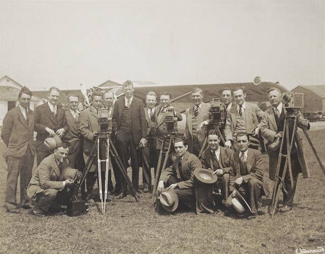Charles Lindbergh (1902-1974) gained international fame as the first pilot to make a solo, nonstop flight from New York to Paris. His 1927 flight helped pave the way to modern commercial air travel. Significantly, Lindbergh is recorded here with the press photographers who helped make him a global celebrity.