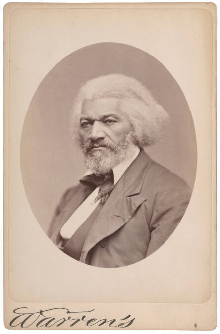 DescriptionOval image of a man, Frederick Douglas, in three-quarter profile. He's dressed in a suit jacket with vest and tie. He has a full beard and his hair is long enough to cover his ears.Gallery LabelThis portrait of abolitionist leader Frederick Douglass, made when he was about 52 years old, conveys Douglass’ commanding physical presence and penetrating gaze. Douglass was astutely aware of the power of the photograph, believing its descriptive capacity naturally served social justice by dispelling prejudices and stereotypes. Douglass used photographs of himself to project an image of African American strength and sophistication. He particularly embraced affordable formats such as the carte-de-visite and larger cabinet card (seen here), because they reached wider audiences.