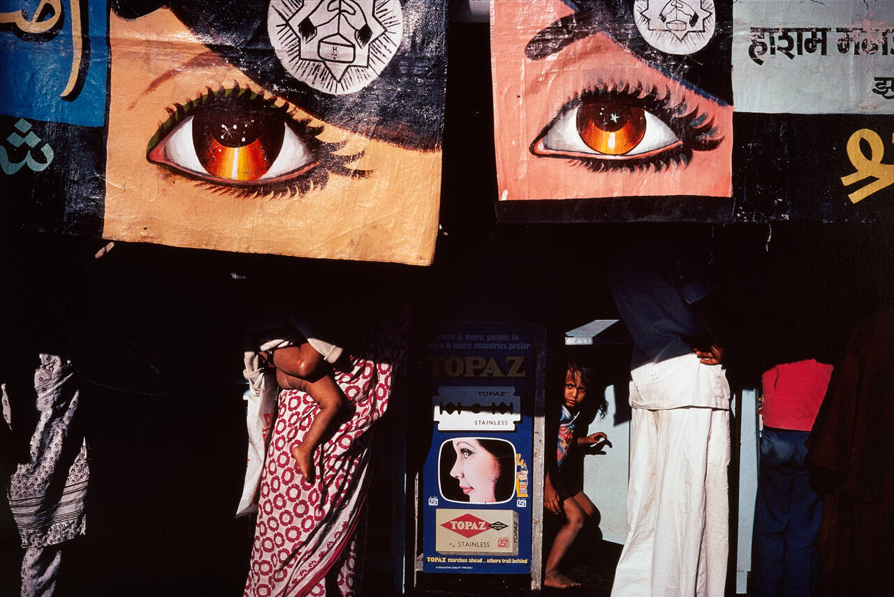 Photojournalist, Alex Webb has worked all over the world, choosing from the beginning of his career to work in color. Webb has a particular fondness for the dramatic saturation and elevated contrast typical of color transparencies (slides). This image, shot in the blazing midday sun, is an elegant smattering of visual fragments. The dominant motif is the emblem of the eye, which symbolizes the inventive power of vision.