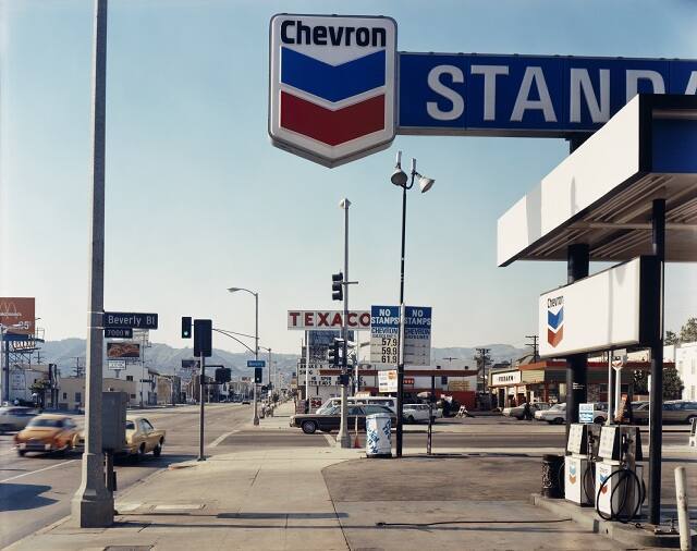 DescriptionImage of gas stations (Chevron, Texaco) along the street.Gallery LabelIn this photograph, Stephen Shore focuses on familiar aspects of American roadside culture: gas stations, traffic lights and advertising signage. He composes this vernacular landscape to highlight the nuances of atmosphere, color and form.