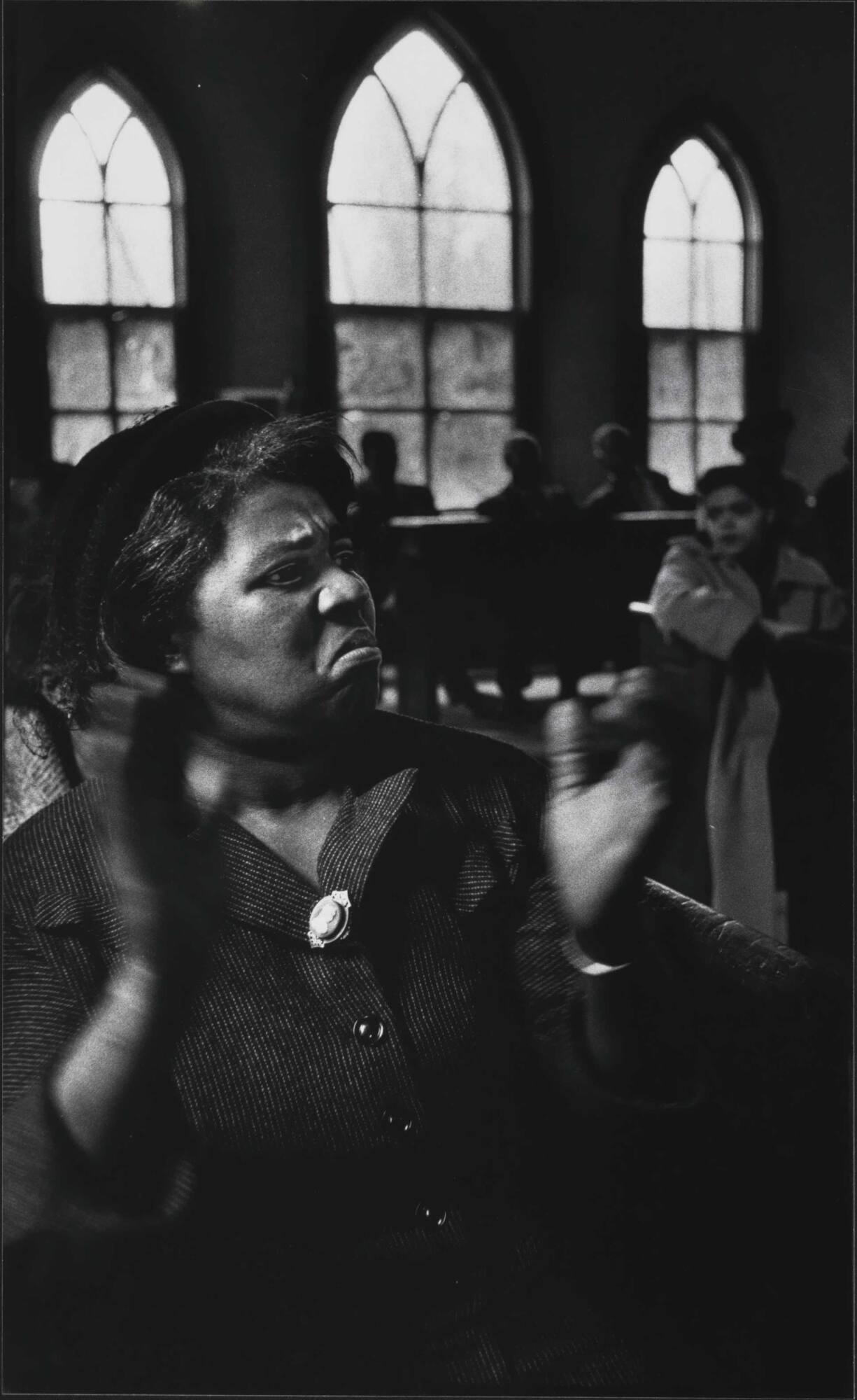 DescriptionVintage gelatin silver print of black woman in church, clapping her hands.Copyright© Estate of James Karales