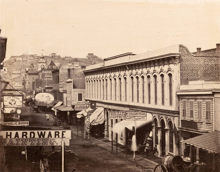 This image is from a series of views taken in 1854-1856 and published in the San Francisco Album: Photographs of the Most Beautiful Views and Public Buildings of San Francisco (1856), the first photographic survey of an American city. This is Kearny Street, in the heart of San Francisco. The city's dynamic economy is conveyed by the variety of businesses and signs visible here. One of these signs marks the daguerreotype studio of James M. Ford, which opened in September 1854.