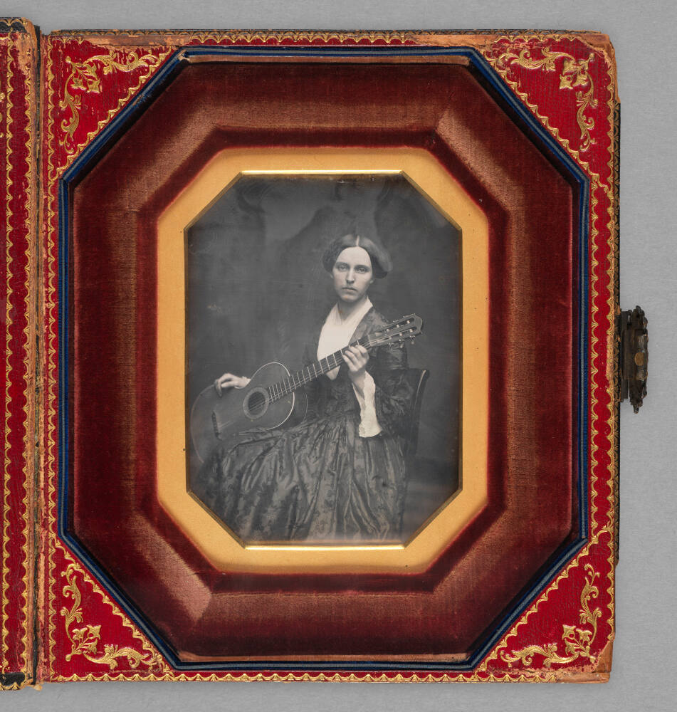 DescriptionImage of a seated woman with hair parted in center wearing a silk dress and holding a guitar. This half plate daguerreotype is installed in an unusually deep case with a brass mat and two velvet-covered liners under the cover glass. Cover glass is pressure fitted against a blue velvet liner.