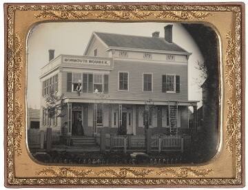 DescriptionImage of a two story house with a porch that spans the entire front. A sign which reads "Monmouth Inquirer" is stretched across part of the top story. A woman wearing a dress with a full skirt is standing by the front door and a man is sitting in the upper window. This quarter plate daguerreotype is housed in a stamped brass mat inside of a case with a floral motif and an embossed red velvet liner.