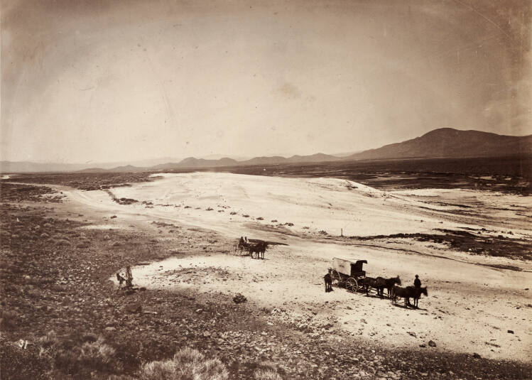 Steamboat Springs, north of Virginia City, was the site of some of O'Sullivan's most iconic images. Arnold Hague, the survey geologist, described the area in his notes: "In several places, the steam issues in puffs, with a noise like that from a steam boiler, and jets of hot water are thrown up, with more or less force, frequently 10 to 20 feet in height." Here, O'Sullivan photographed his wagon perched on top of a mound of silica, a material produced when geothermal water interacts with oxygen.