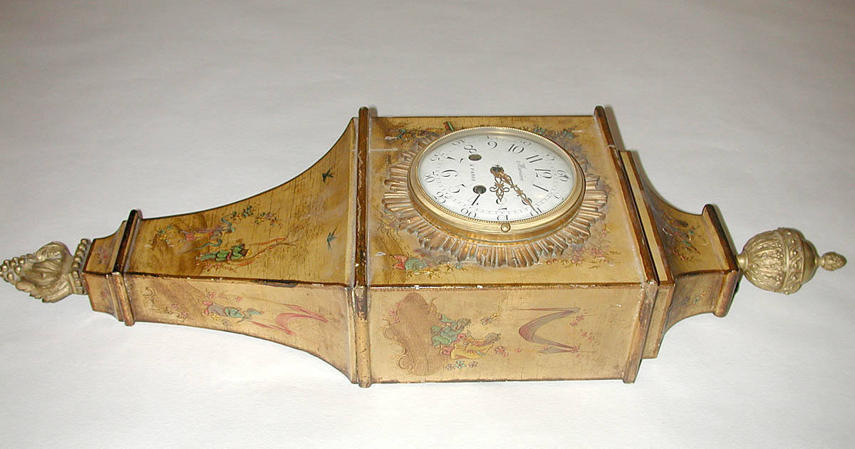 DescriptionThe later pendulum movement (stamped: Medaille l'or/Paris 1900/Samuel Marle (?) Planchon/Paris) with white enamel dial having two sets of black arabic numerals to indicate minutes and seconds and surrounded by an ormolu sunburst contained in lacquered case with chinoiserie decorations -- dancers, musicians, animals, flowers, and banners against a pale yellow background -- and an ormolu acorn at bottom, and urn with acorn at top.