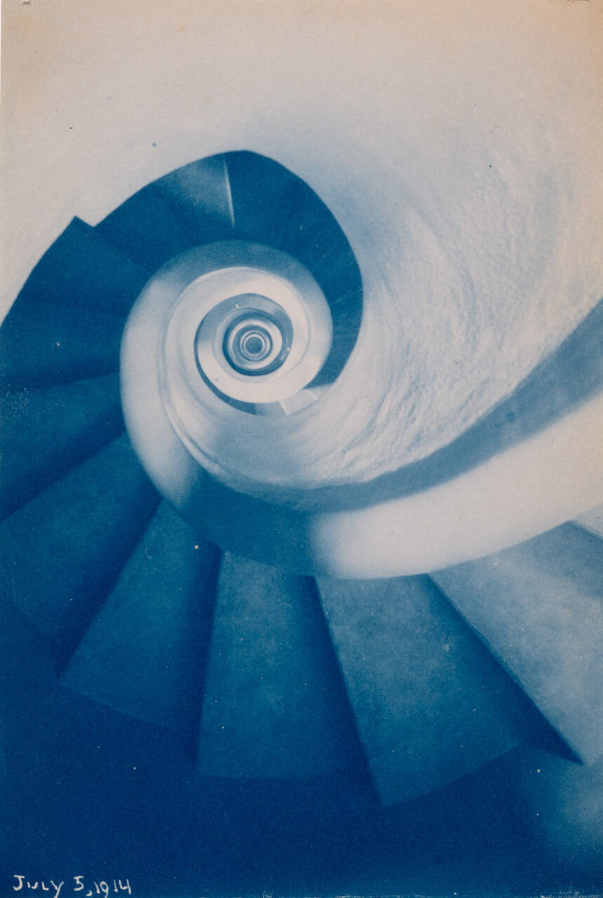 DescriptionImage of a winding staircase fading from dark blue at the bottom to white at the top.