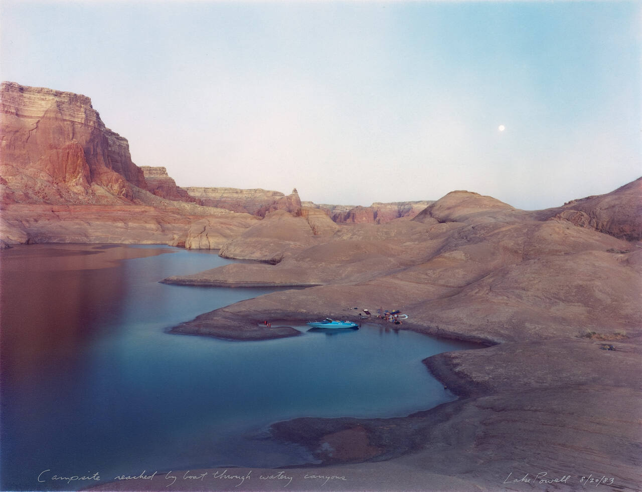 Campsite reached by boat through watery canyons, Lake Powell, 8/20/83 (A.P.)