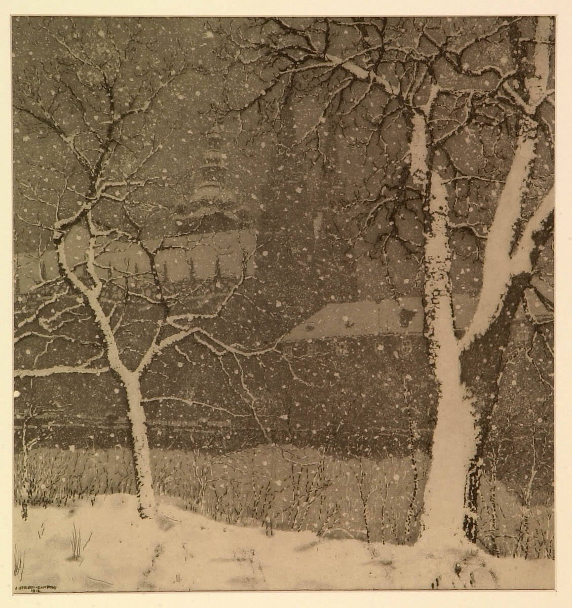 Gallery LabelJaromír Stretti-Zamponi used the aquatint (powdered resin) etching process to enhance the soft, tonal quality of a snowy day in this print. Here, Prague Castle looms in the background, framed by two barren, snow-covered trees. The castle complex, which includes the magnificent St. Vitus Cathedral and other ecclesiastical buildings, is the largest in the world. It covers an area of nearly 84,000 square yards—that’s larger than 13 football fields. Today, it is a protected UNESCO World Heritage site.
