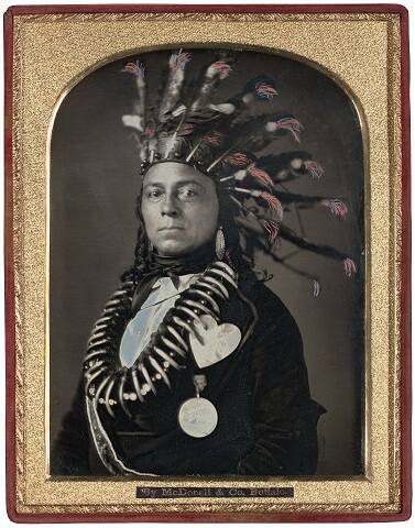 DescriptionImage of an Indian Chief in full headress which has been colored red. He is dressed in a suit and wears a necklace made of animal bones. This half plate cased daguerreotype is housed in a brass mat with the artist's label. An accompanying note is pinned to the inside of the case.Gallery LabelThe subject of this magnificent plate, a member of the Mississauga band of the Ojibwa Indian tribe, was born near Toronto, Canada, in 1811. Raised in the Methodist Church, he took the Christian name George Henry at his baptism in 1824. After working as a government interpreter for several years, Maungwudaus assembled a performing troupe of family and friends in 1845. After appearing in several American cities, from Detroit to New York, they undertook a successful tour of Europe, from 1845 to 1848.