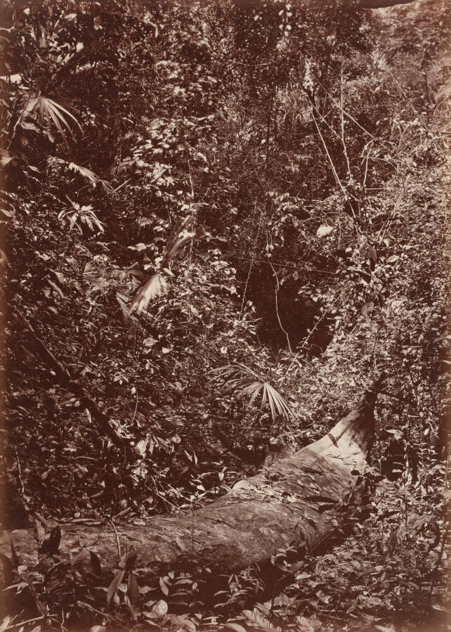 In 1871 Moran worked as the official photographer for the Darien Survey, a Navy expedition led by Commander Thomas O. Selfridge Jr., to determine the feasibility of a canal across the Isthmus of Darien, Panama. Given the engineering technologies of the day, Selfridge's findings were not encouraging. This photograph speaks volumes: the luxuriant jungle growth appears as impenetrable as a brick wall.
