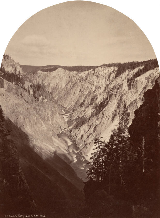 DescriptionImage of a river running through the valley of steep mountains; evergreens in the foreground lower right and along the ridges.Gallery LabelTraveling with painter Thomas Moran and a group of geologists, William Henry Jackson used his camera to record the vastness and beauty of the land that would become Yellowstone National Park. The photographs made during that excursion, including this one, helped persuade Congress to pass legislation in 1872 recognizing Yellowstone as the first national park in the United States. Jackson later recalled his journey through this canyon as “the climax of the expedition.”