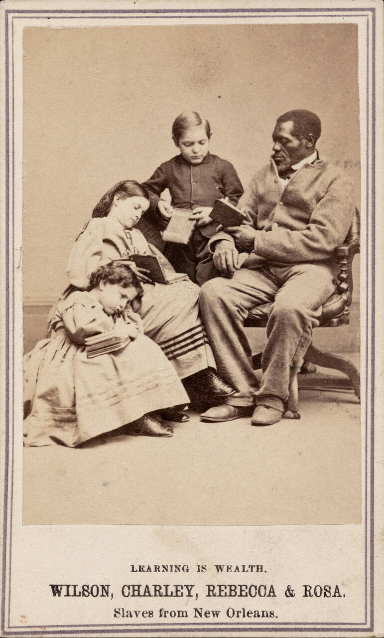 InscribedOn mount recto, bottom, in black type: "LEARNING IS WEALTH. / WILSON, CHARLEY, REBECCA & ROSA. / Slaves from New Orleans."