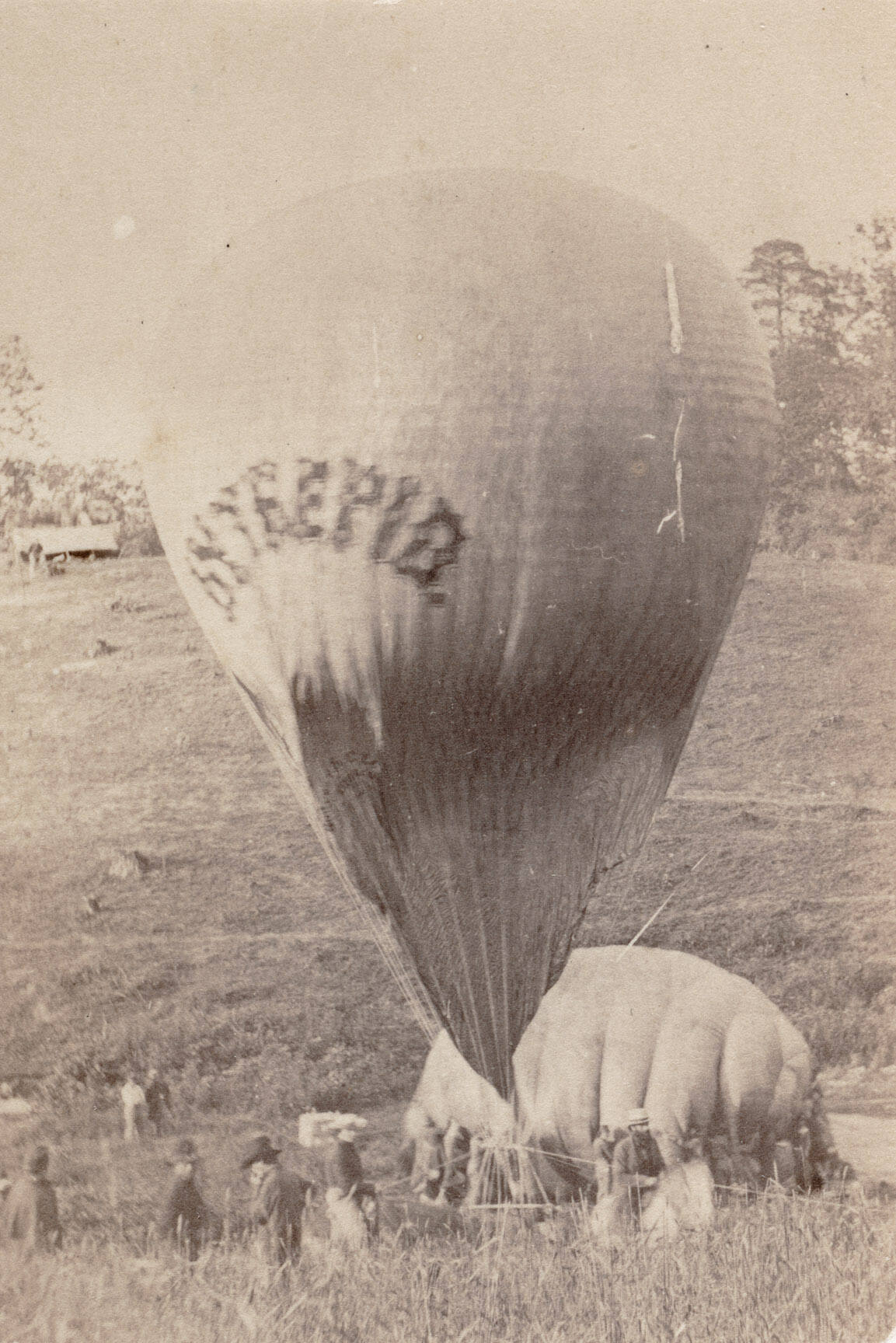 InscribedOn mount verso, center, typed in black: "BRADY'S ALBUM GALLERY. / No. 424. / Professor Lowe inflating Balloon Intrepid / FROM GAS IN BALLOON CONSTITUTION. / The Photographs of this series were taken directly from nature, at con- / siderable cost. Warning is therefore given that legal proceedings will / be at once instituted against any party infringing the copyright."