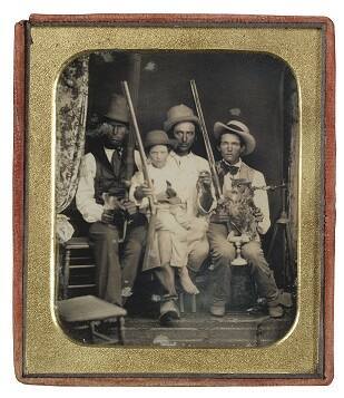 DescriptionImage of three men and a boy holding rifles and an owl; all seated and wearing hats. This sixth plate daguerreotype is housed in a brass mat inside of case with the Ornate Delicate Roses motif and faded pink silk liner.