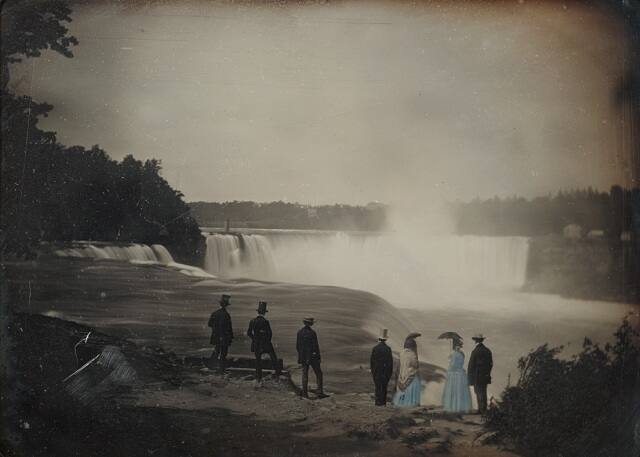 DescriptionImage of a well dressed group, two women wearing dresses with full skirts and bonnets while carrying umbrellas and five men wearing suits with stovepipe hats, standing along the shoreline looking out onto a waterfall. This whole plate daguerreotype is housed in a walnut and gold frame with paper mat.Exhibition HistoryDeveloping Greatness: The Origins of American Photography, 1839-1885. The Nelson-Atkins Museum of Art, Kansas City, MO, June 9 – December 30, 2007, no. 56.