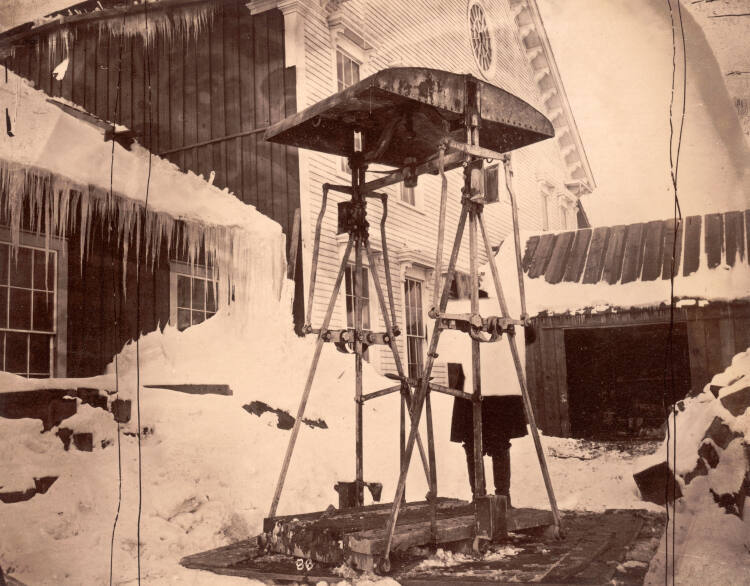 At the Savage mine, O'Sullivan photographed one of the cages used to transport workers and cars up and down the central mine shafts. The snow in this view testifies to the harsh winter of 1867-68. O'Sullivan had a companion hold a white card or sheet behind the cage to so that details of the mechanism could be more cleanly recorded. This sheet obscures the man's top half, creating a surreal image of a figure without a torso or head. In addition, this negative is scarred by crop marks intended to eliminate much of the distracting background.