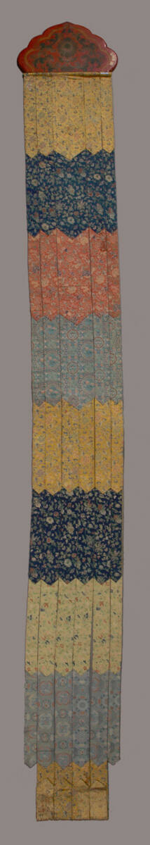 DescriptionTemple streamer, five strips wide at the top, but the middle strip divides in the center, so it is six strips wide at the bottom. Each strip has nine colors, which are yellow, dark blue, red, powder blue, yellow, dark blue, green, powder blue, and yellow, from top to bottom. The top is a red painted wooden piece.