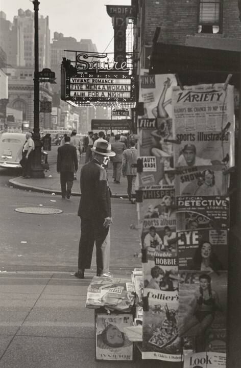 DescriptionVintage gelatin silver print, dated June 11, 1949. "HP21" in pencil on back. Image of a man on the sidewalk, newsstand in right foreground.Exhibition History