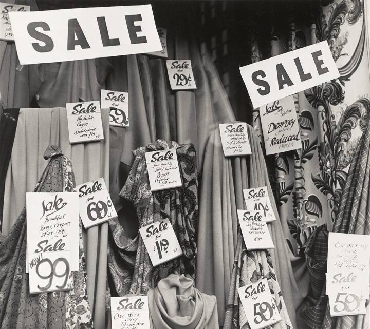 DescriptionImage of a window display with sale signs hanging from sections of fabric.Exhibition HistoryThe Photographs of Homer Page: The Guggenheim Year, 1949-1950. The Nelson-Atkins Museum of Art, Kansas City, MO, February 14 - June 7, 2009, no. 19.