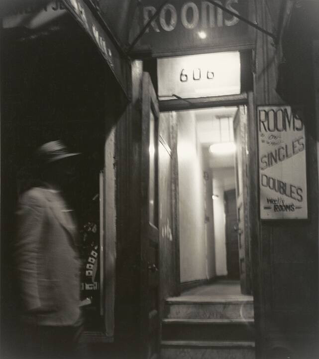 DescriptionVintage gelatin silver print, dated June 19, 1949. "HP37" in pencil on back. Image of the doorway of a rooming house.Exhibition History