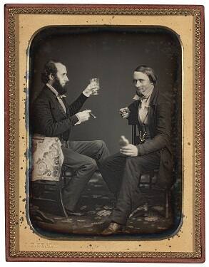 DescriptionImage of two men, facing each other, wearing suit and tie. The man on the left holds up a glass with one hand and a cigar in the other. The man on the right smiles as he looks towards the viewer. This quarter plate daguerreotype is housed in a brass mat inside of a tray with gold tooling.Published ReferencesSouth Carolina, Vol. 12, n.p. [internal index], R. G. Dun & Co. Collection, Baker Library, Harvard Business School, Cambridge, Mass. See also: Photographic and Fine Art Journal (December 1851): 376; and Brian Wallis, "Black Bodies, White Science," American Art 9:2 (Summer 1995): 39-61.