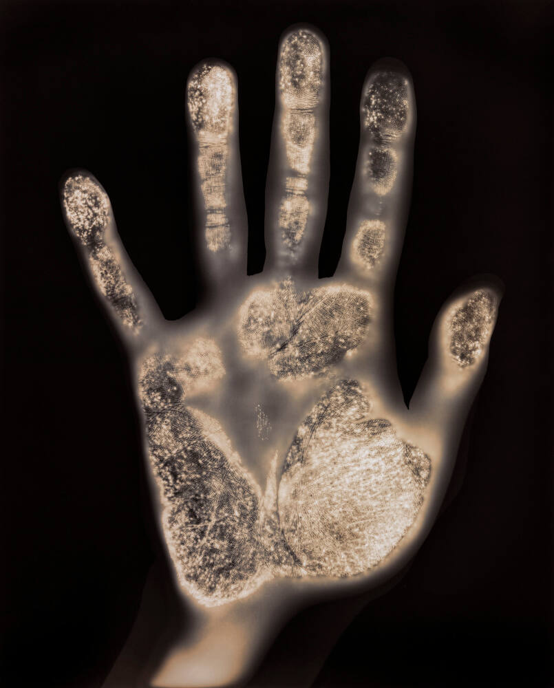 DescriptionImage of a person's hand (palm).Gallery LabelThis image records a literal trace of human touch. In a darkroom, Gary Schneider asked a friend to press his hand directly on a sheet of black-and white film. The natural oils of the skin imprinted on the film and helped produce the image we see.