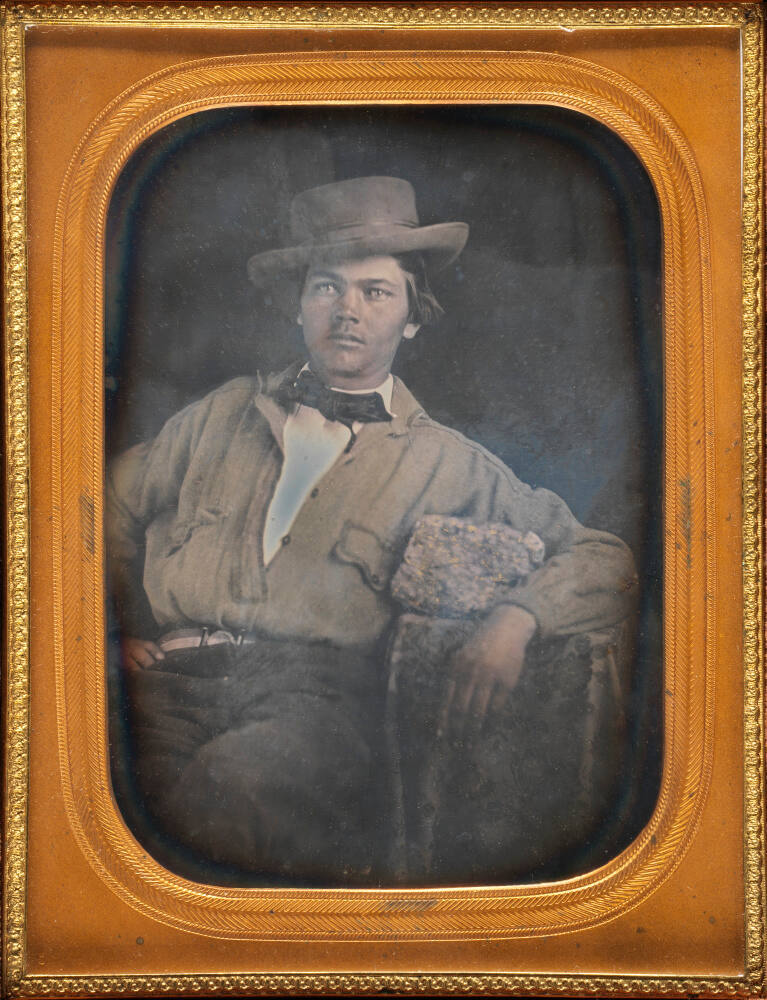 DescriptionImage of a young man seated with his arm around a gold veined rock on the table beside him. He wears a tie and a brimmed hat. This quarter plate daguerreotype is housed in a brass mat with an emerald green liner inside of a decorative paper covered wooden case with metal clasps; the case design depicts a decorative urn and flowers.