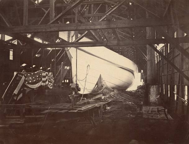 DescriptionImage of the hull of a boat under construction; an American flag is draped over the staircase to the left.Exhibition HistoryDeveloping Greatness: The Origins of American Photography, 1839-1885. The Nelson-Atkins Museum of Art, Kansas City, MO, June 9 – December 30, 2007, no. 458.