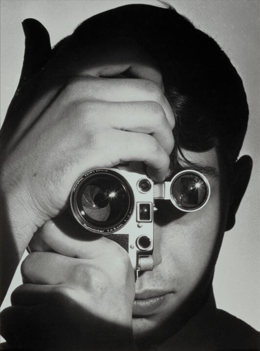 Born in Paris, Andreas Feininger studied architecture in Germany, using a camera as an aid in creating his building designs. He emigrated to the U.S. in 1939, and in 1943 became a staff photographer for Life magazine where he completed more than 430 assignments in 20 years. Most of Feininger’s best work showed the majesty of New York skylines, machines, bridges, and tunnels. Here, Feininger uses a camera to build a creative portrait of fellow photographer Dennis Stock. Positioning the lens and viewfinder as Stock’s eyes, Feininger pays homage to his own profession: the photographer’s camera is a piece of himself.