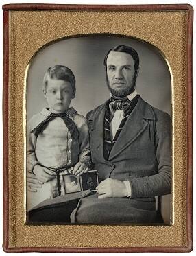 DescriptionImage of bearded man and a young boy, the boy is holding an open daguerreotype displaying a child lying on its back with eyes closed. This quarter plate daguerreotype is housed in a brass mat.