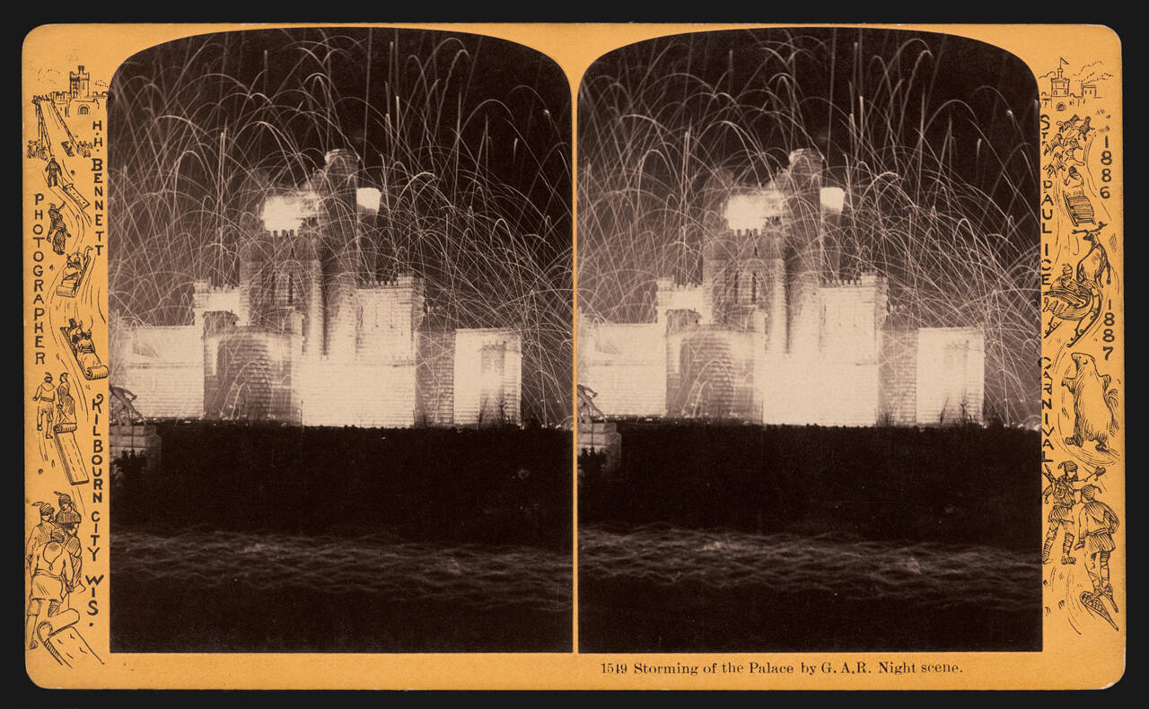 On mount recto, lower right, in black type: "1519 Storming of the Palace by G.A.R. Night scene."