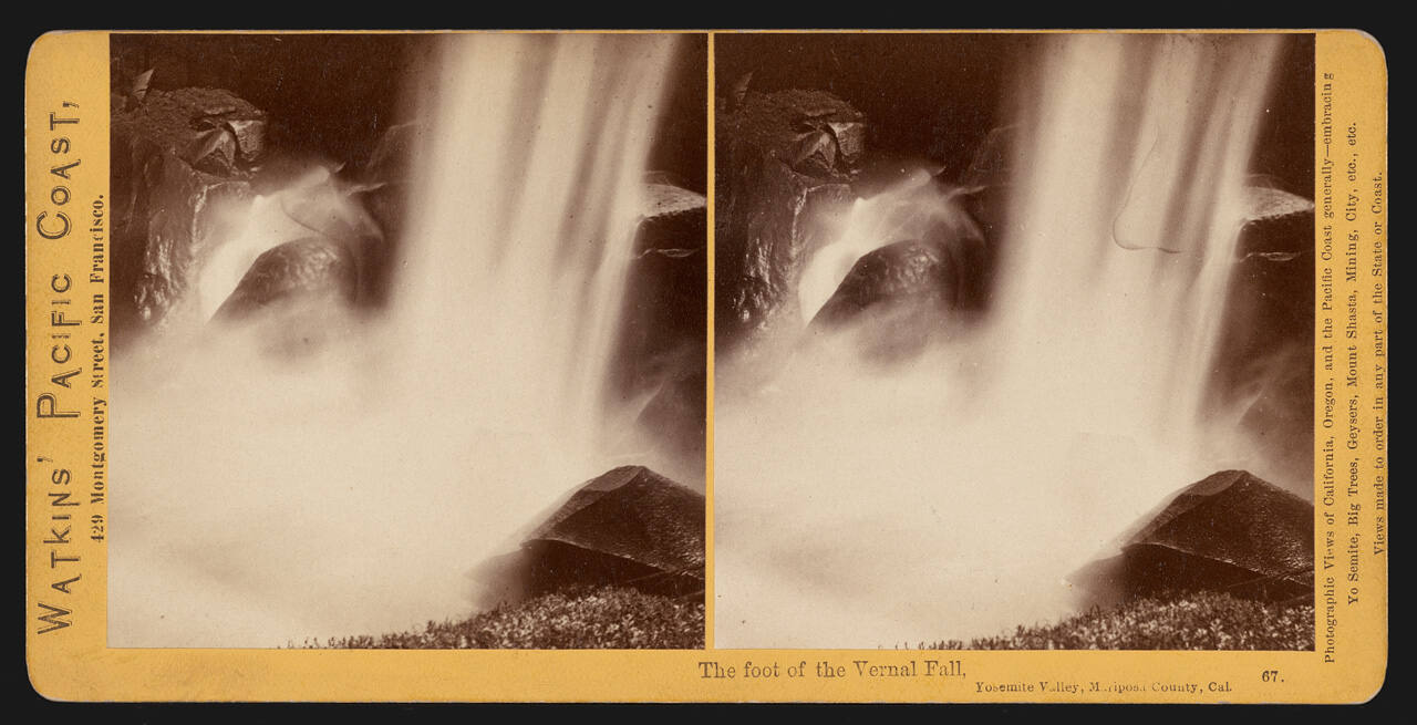 InscribedOn mount recto, bottom, in black type: "The foot of the Vernal Fall, / Yosemite Valley Mariposa County, Cal. 67.";
