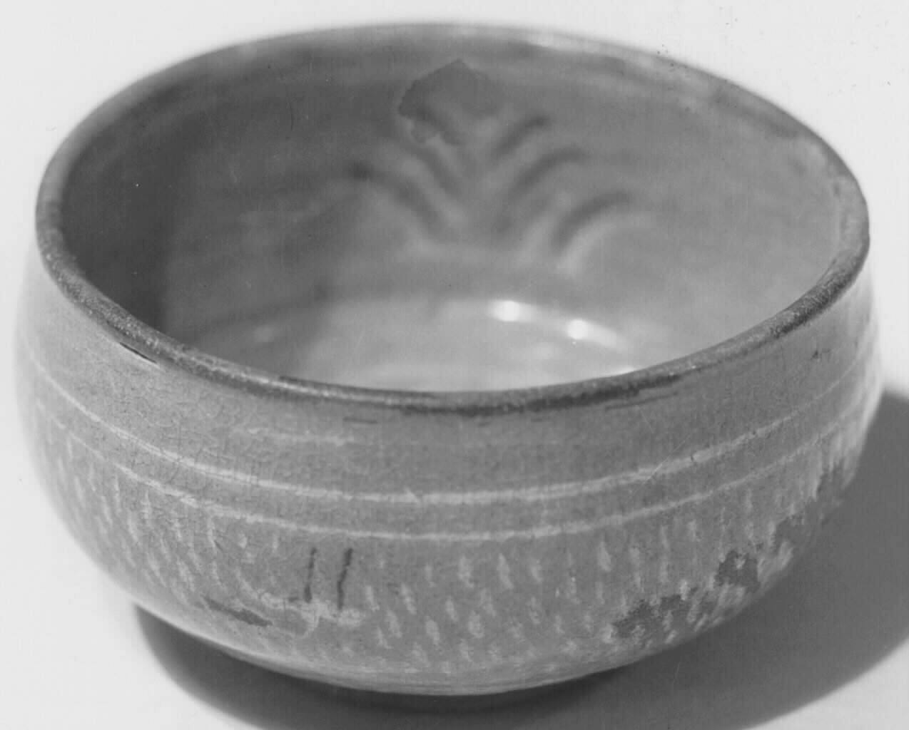 DescriptionLight gray stoneware with decoration of crane in flight inlaid with black and white slip under celadon glaze.