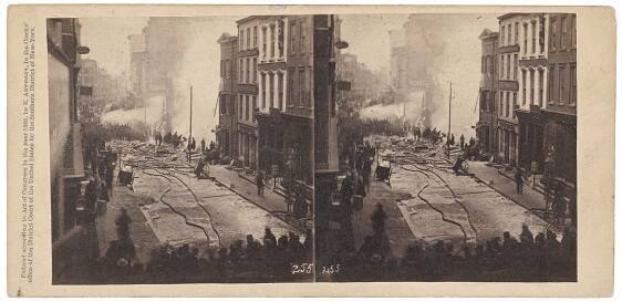 On mount verso, center, white label, in black type: "ANTHONY'S INSTANTANEOUS VIEWS, / No. 255. / THE BURNING OF CYRUS W. FIELD'S WAREHOUSE IN NEW YORK. / Photographers will appreciate the merits of this picture when they are informed that it was taken on a / dark day just previous to a heavy snow storm, and with the Thermometer below 20˚ Fahrenheit. The / stream of water projected across the street proceeds from one of the large steam fire engines, whose efficien- / cy was never more fully displayed that on that occasion. / [COPYRIGHT SECURED.]".