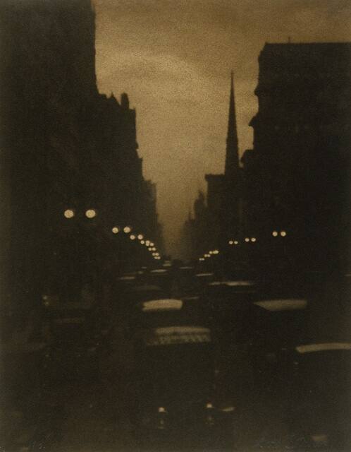 Karl Struss used the camera as a means of poetic expression—he was interested in mood and mystery rather than “simple” documentary facts. This work, one of his largest and most important photographs, exists in three known original examples—each markedly different in tonality and image color. Stylistically, this photograph looks both backward and forward in time. The soft focus effect is characteristic of artistic approaches prior to 1910. However, its modern subject— traffic on Fifth Avenue—points to the concerns of a later generation of photographers.