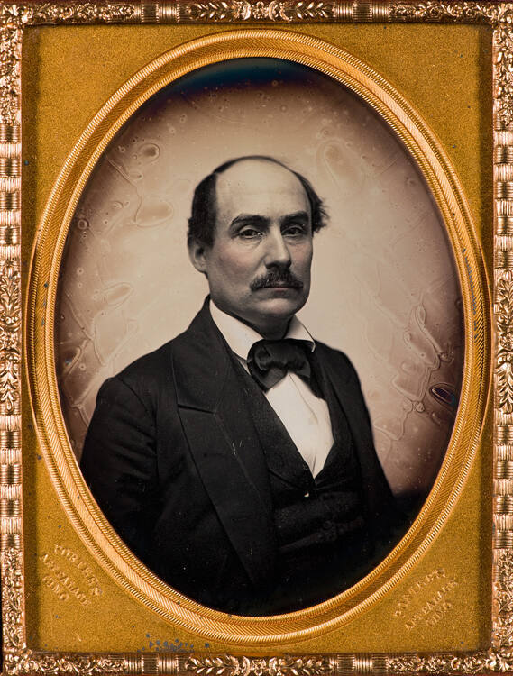 Description1/4 plate daguerreotype in full leather case (top detached). Maker's mark on mat twice. Oval image of a man.