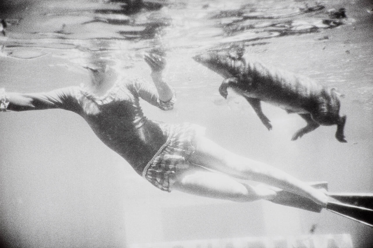 DescriptionImage of a woman and a pig swimming underwater.Copyright© The Estate of Garry Winogrand