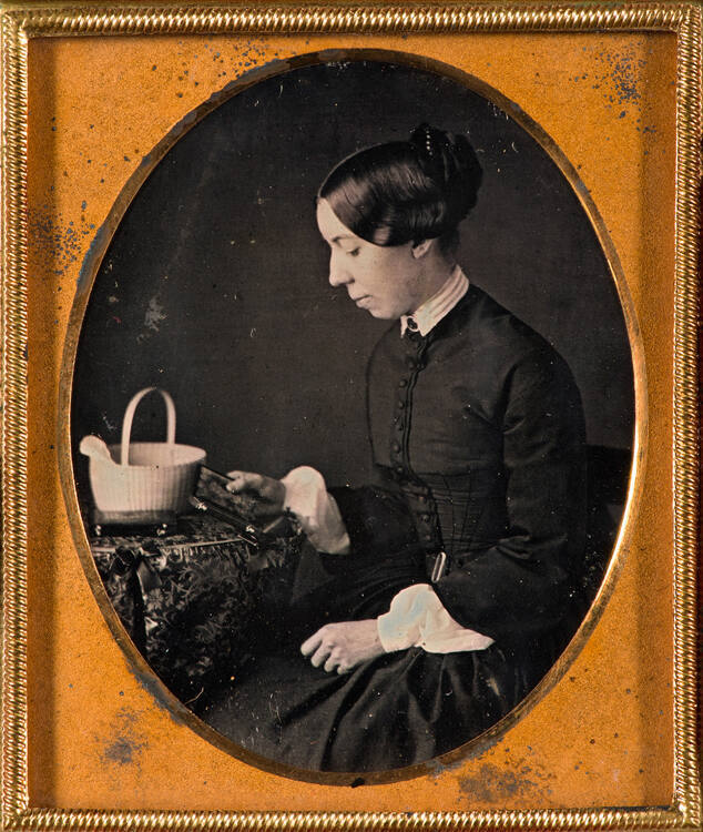 Catherine Ann Brown, seated, holding daguerreotype