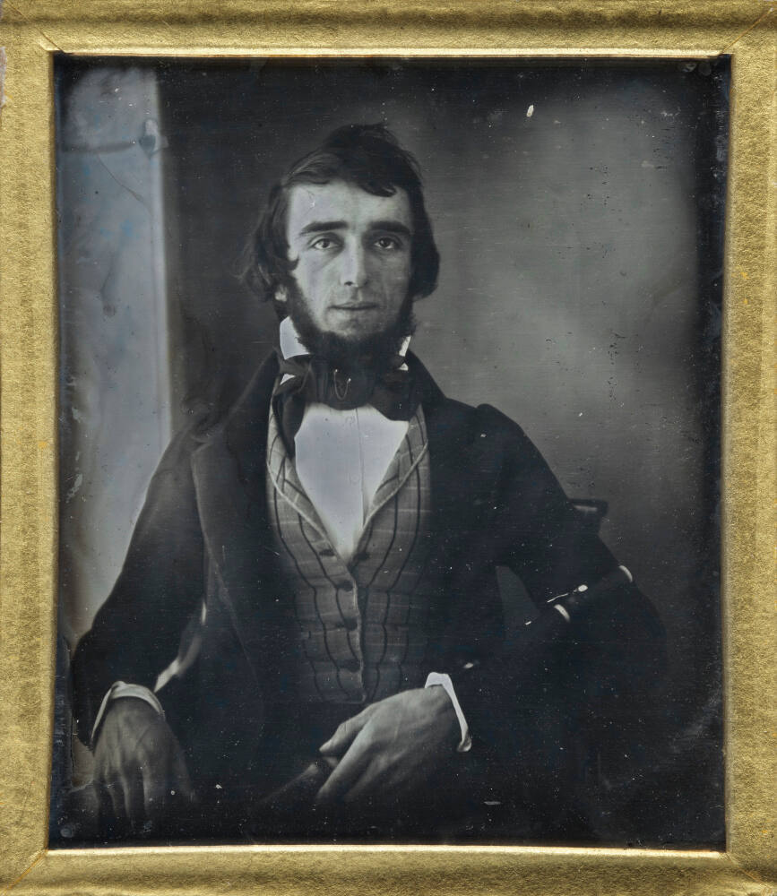 DescriptionImage of a man wearing a bow tie and plaid vest cradling a clarinet in his arm. This sixth plate daguerreotype is housed in a brass colored paper mat inside of a brown case embossed with a single stem flower at the corners and a dark purple velvet liner.