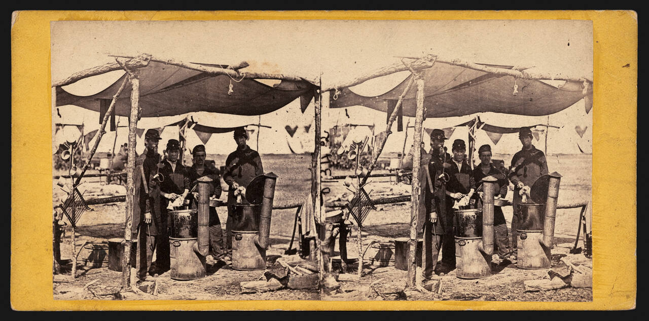 InscribedOn mount verso, center, white label, in black type: "WAR VIEWS - ARMY OF THE POTOMAC. / No. 2057 / THE WAY THEY COOK DINNER IN CAMP."