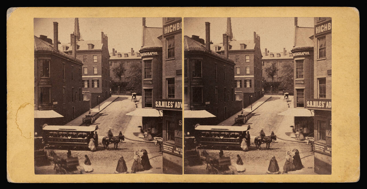 SignedOn mount verso, center, blue label, in black type: "Photo. by HEYWOOD / Published by Hervey Friend, Gloucester, Mass., U.S. / Scollay's Building - Street View. Instantaneous."