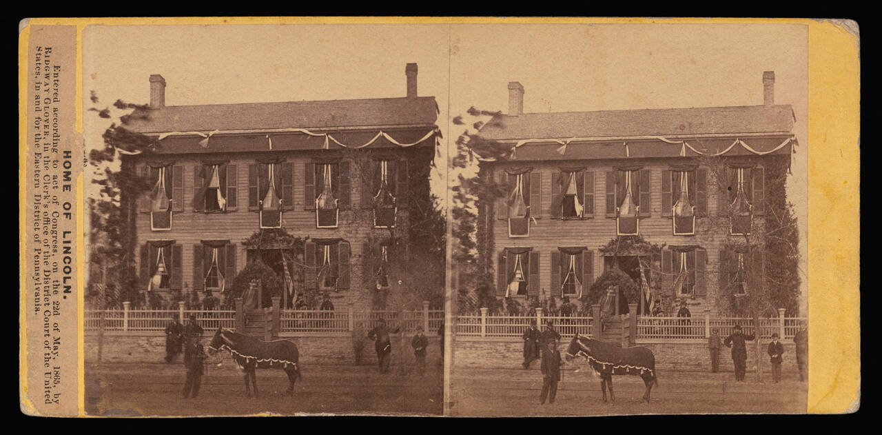 SignedOn mount recto, left edge, white label, in black type: "HOME OF LINCOLN. / Entered according to act of Congress, on the 22d of May, 1865, by / RIDGWAY GLOVER, in the Clerk's office of the District Court of the United / States, in and for the Eastern District of Pennsylvania."