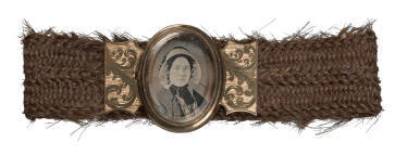 DescriptionA hair bracelet with gold attachments and an oval daguerreotype portrait of a woman wearing a white bonnet.