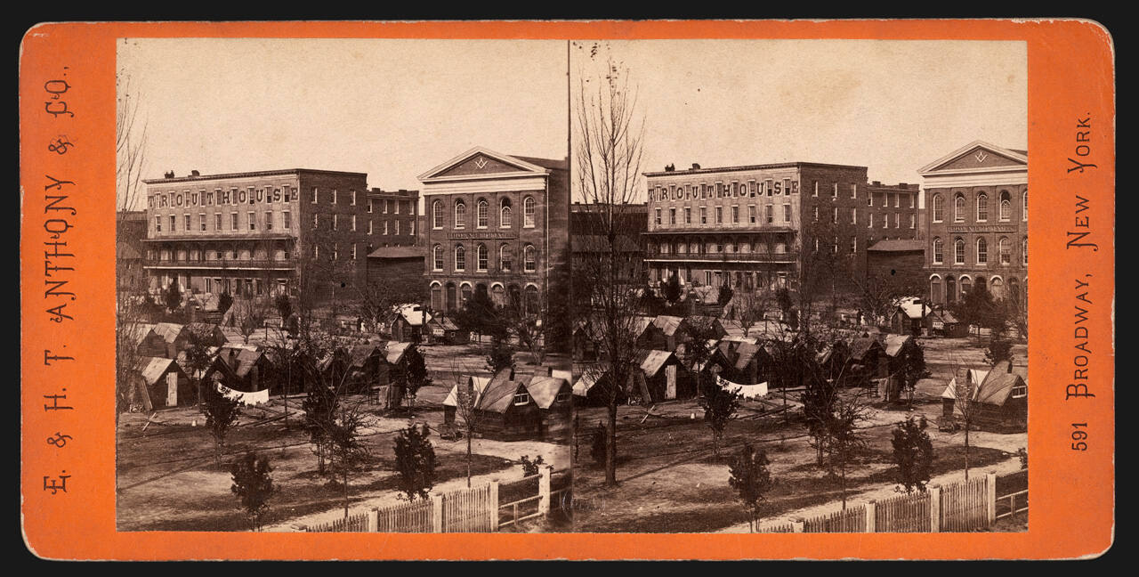 On mount verso, center, green label, in black type: "WAR VIEWS. / Front House and Masonic Hall, Marietta St., Atlanta. / No. 2710 / PUBLISHED BY E. & H. T. ANTHONY & CO., / AMERICAN AND FOREIGN STEREOSCOPIC EMPORIUM, 501 BROADWAY, NEW YORK."