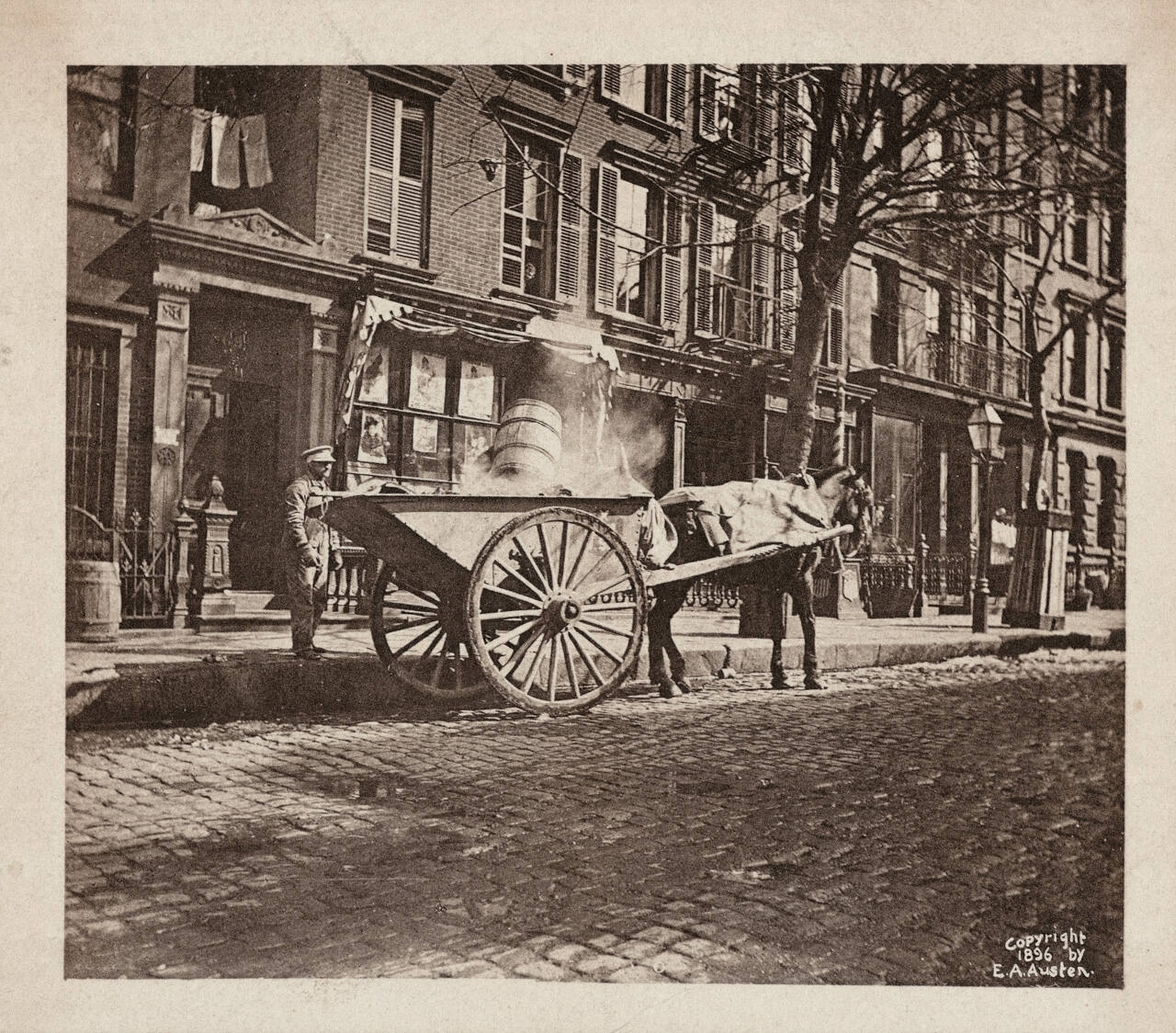 DescriptionImage of a horse drawn wagon on a cobblestone road with a uniformed man standing on the sidewalk. A row of brick buildings line the background.Gallery LabelAlice Austen’s series Street Types of New York City (1896) picture workers in lower Manhattan: a bicycle messenger, garbage collectors, a carriage driver. The entire portfolio included 150 portraits, an early example of social documentary portraiture in the United States.