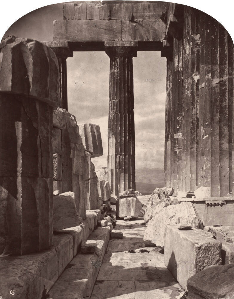 DescriptionImage, Plate 15, of a stone structure with columns at regular intervals; there is a column at the far end which divides a forested mountain landscape and cloud filled sky.Gallery LabelWilliam James Stillman was a journalist, art critic, aspiring painter and founder of the Crayon, one of the most influential art journals of the period. He counted among his friends and influences the writer Ralph Waldo Emerson, the scientist Louis Agassiz and the British art critic John Ruskin. Stillman made extensive photographic surveys in 1869 and 1882 in Greece, at the Acropolis. This image, composed to emphasize the structural grandeur of the Parthenon, is a testament to both the beauty of the classical architecture and the capacity of photography to render its timeless qualities through light, shadow and lush tonalities.