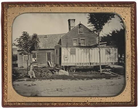 DescriptionImage of an Ambrotype Studio on wheels parked in front of a house. A man stands under a small tree nearby with one hand on his hip and the other on the handle of a small wagon. This half plate ambrotype is housed in a brass mat inside of a case with an embossed red velvet liner in a case with a grape motif.