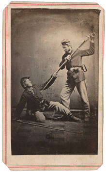 DescriptionImage of two uniformed soldiers in hand to hand combat. One man stands above another man holding a weapon up to his chest.
