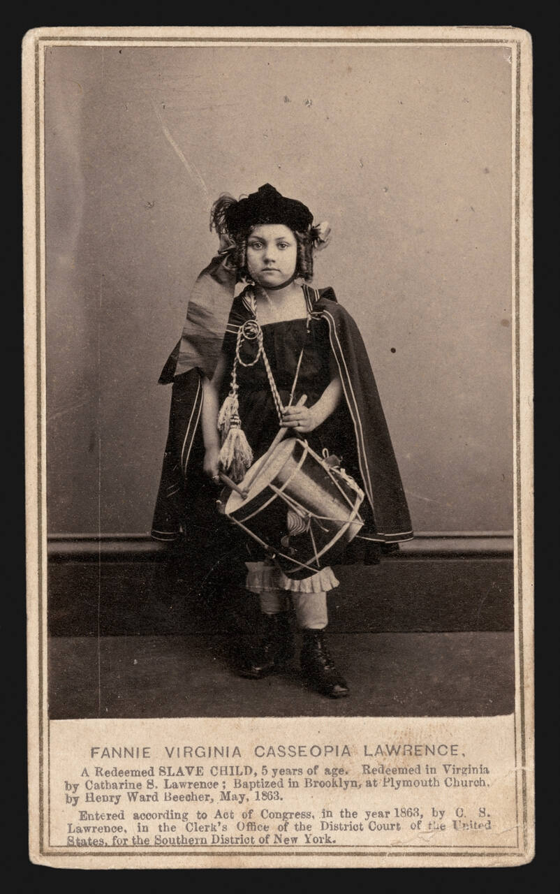 InscribedOn mount recto, bottom, in black type: "FANNIE VIRGINIA CASSEOPIA LAWRENCE, / A Redeemed SLAVE CHILD, 5 years of age. Redeemed in Virginia / by Catherine S. Lawrence; Baptized in Brooklyn, at Plymouth Church, / by Henry Ward Beecher, May, 1863".